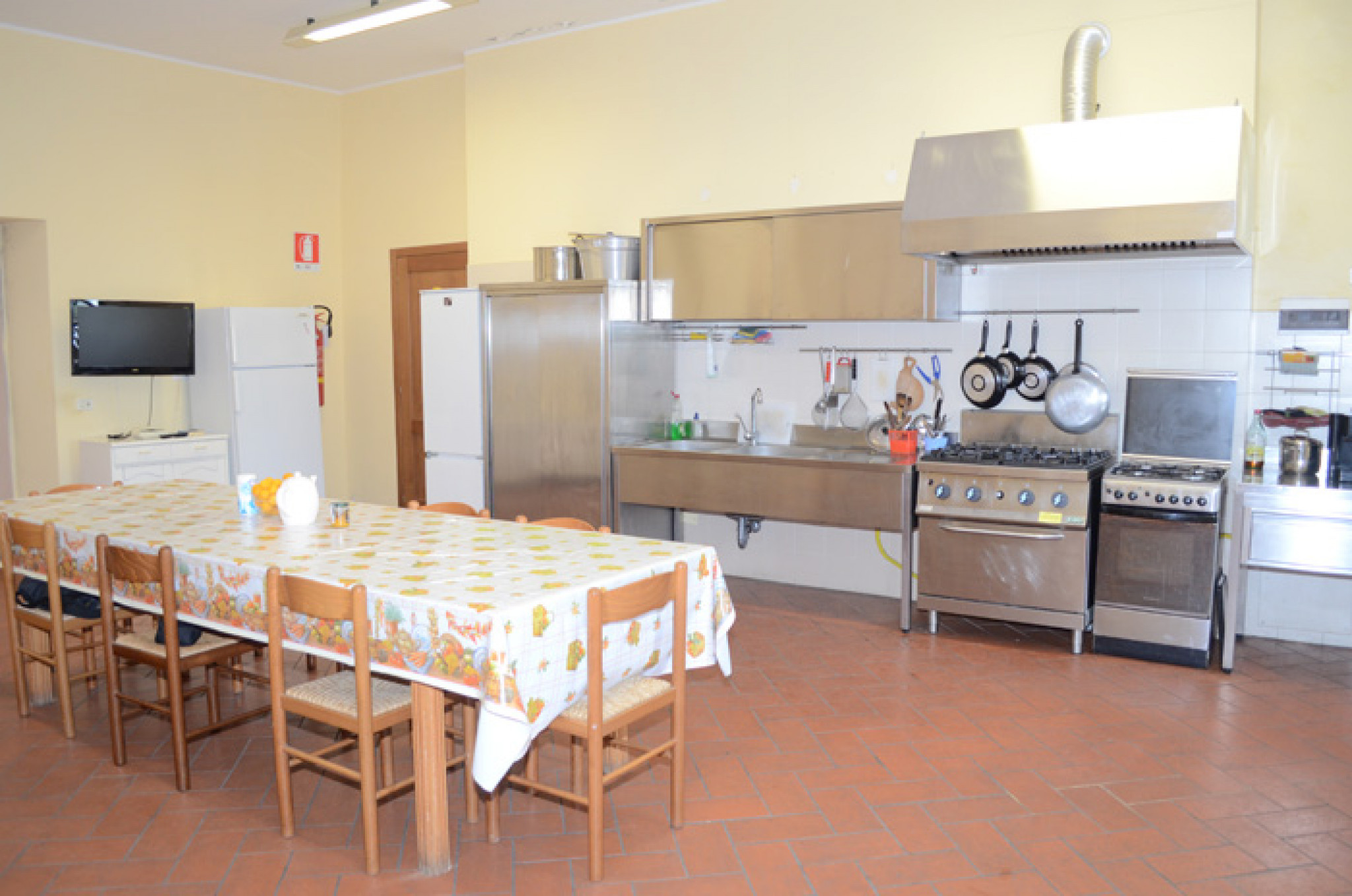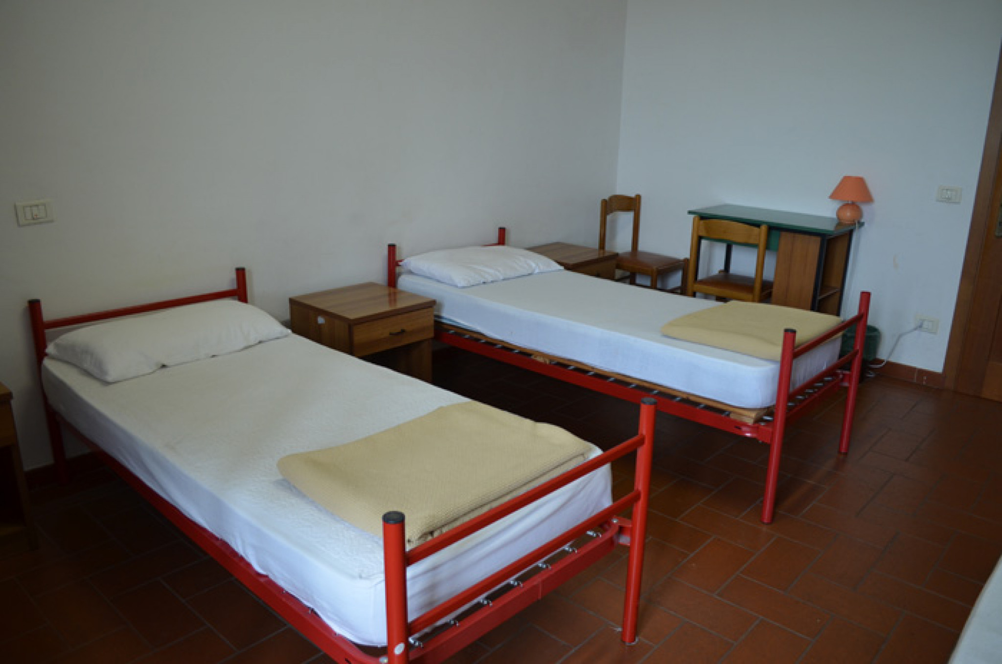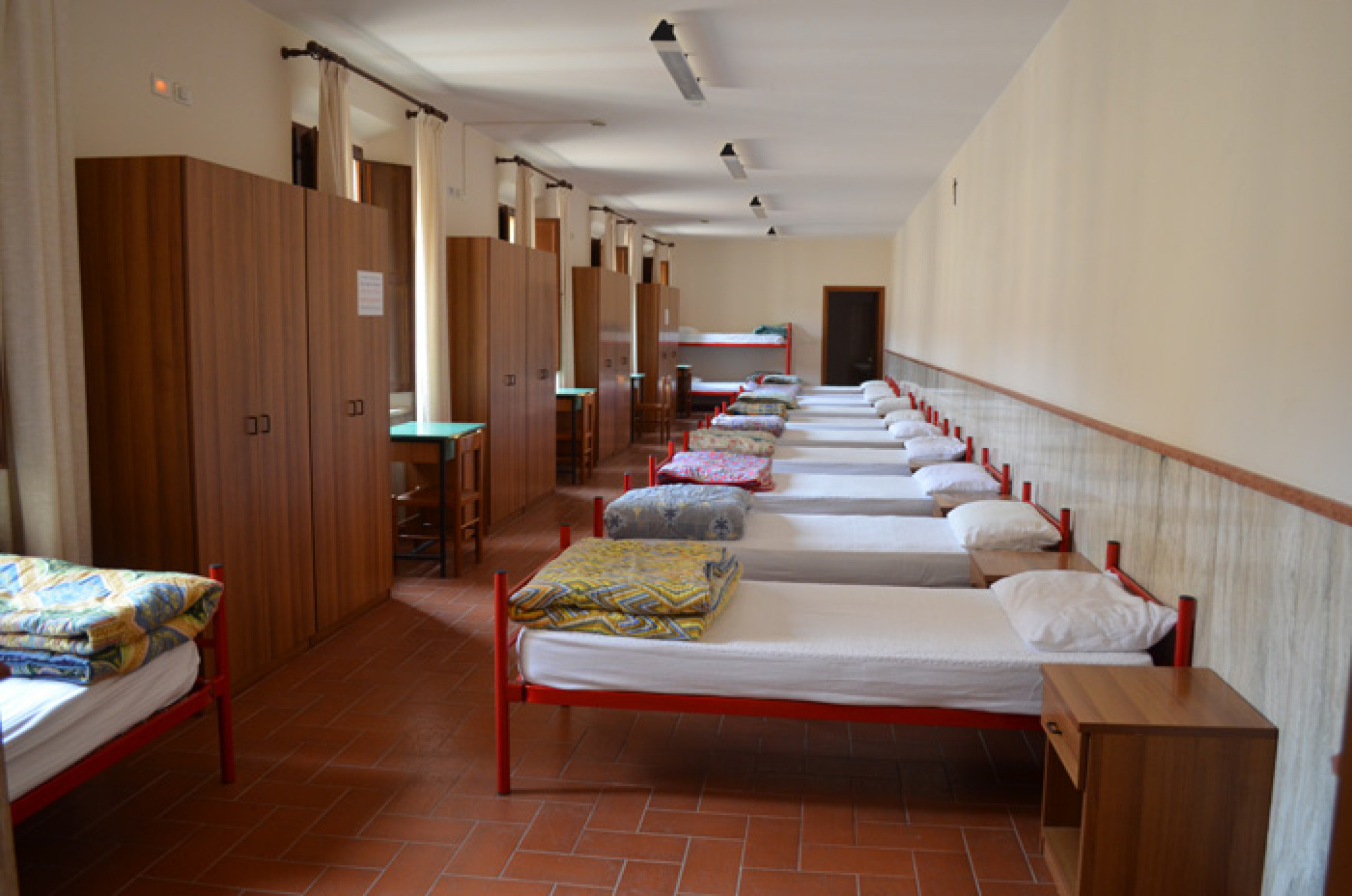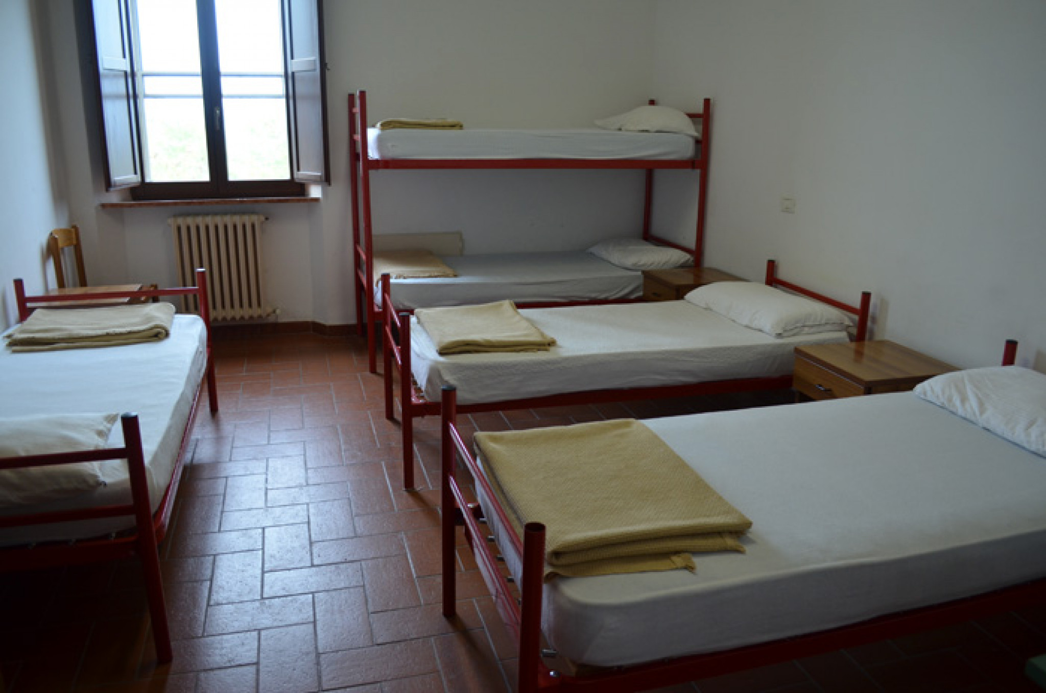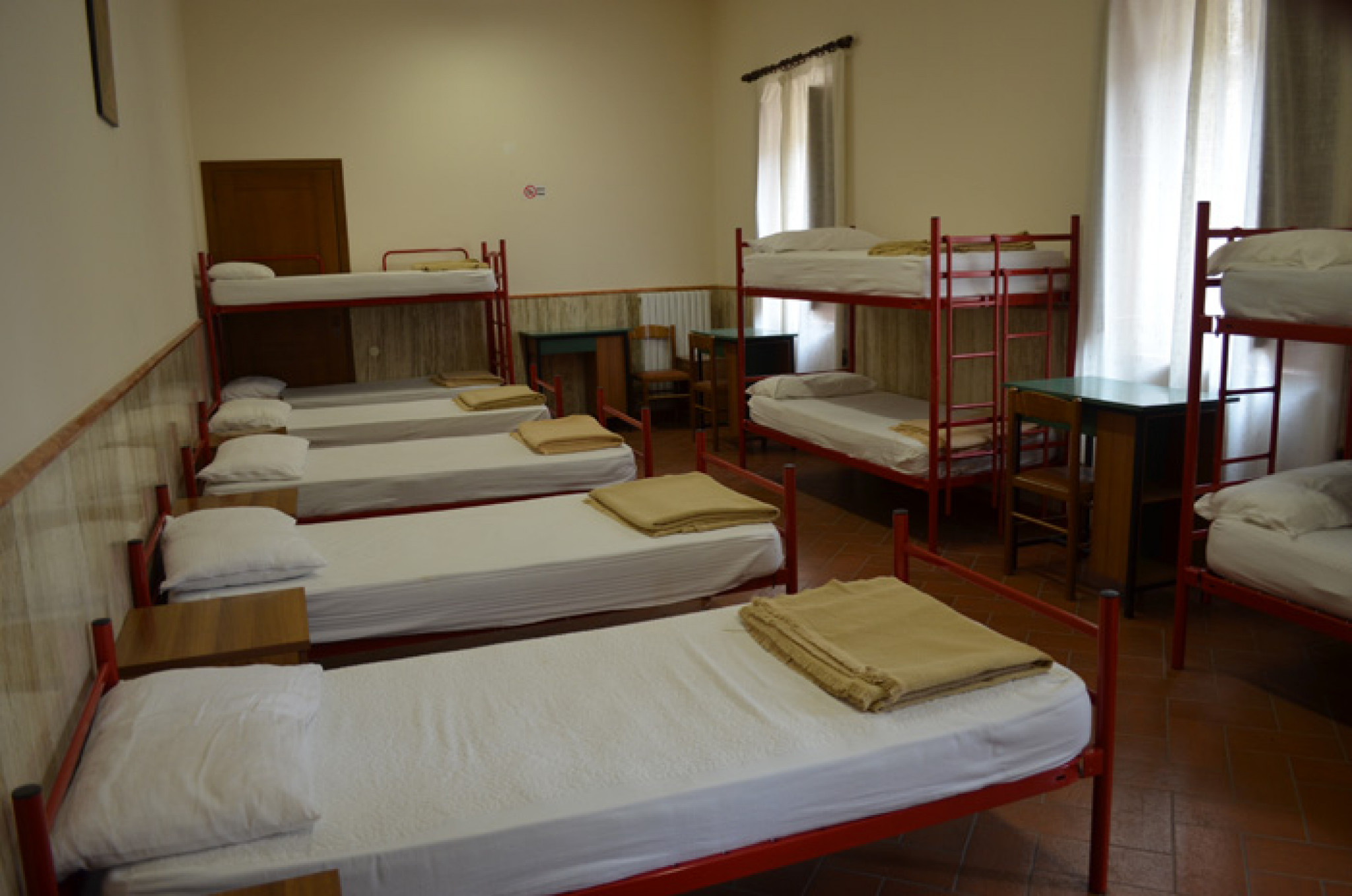 La casa di accoglienza, rinnovata e strutturata all’interno del convento, può ospitare piccoli gruppi fino a 25 persone.Affacciata sul chiostro romanico del convento e appoggiata sulle mura romane della città, offre ai pellegrini una permanenza di pace e di silenzio.Vengono ospitati prevalentemente gruppi per il solo pernottamento o in autogestione per ritiri e convivenze.Dispone di circa 30 posti letto in cameroni distribuiti in piccoli cameroni.I bagni con sufficienti lavandini e docce, divisi uomini e donne, sono nel corridoio. C’è una ampia cucina attrezzata, con freezer e frigoriferi, fornelli e pentole, stile comunità, disponibile per i gruppi in autogestione.Ci sono due ampie sale polivalenti, una con i tavoli, disponibile per i pasti e l’altra per convegni e conferenze con una capienza di un massimo di 100 persone.E’ disponibile anche una cappella interna per piccoli gruppi, fino circa 30 posti.